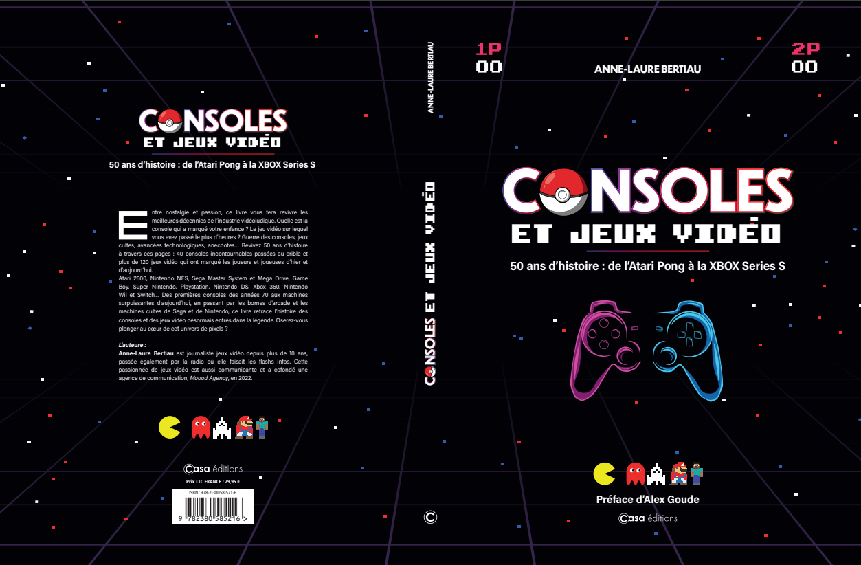 Avant de parler du livre, petite présentation de l’auteure Anne-Laure Bertiau. Elle est journaliste jeux vidéo depuis plus de 10 ans. Elle est évidemment passionnée de jeux vidéo cela se ressent très clairement lors de la lecture de son bouquin ^^. Elle est également communicante et a cofondé une agence de communication Moood Agency en 2022. Passons maintenant au livre Consoles et Jeux Vidéo 50 ans d’histoire : de l’Atari Pong à la Xbox Series S édité par Casa éditions. J’ai trouvé la couverture du bouquin sobre mais aussi très sympa avec évidemment de nombreuses références à la culture (rétro)gaming.