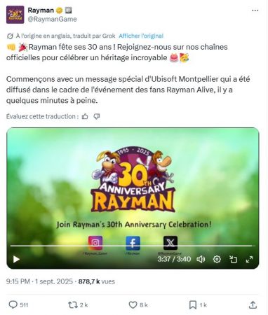En attendant, souhaitons un joyeux anniversaire à notre Rayman adoré!!! Histoire de fêter cet évènement comme il se doit, voici une petite vidéo diffusée sur le compte X @RaymanGame! Je vous conseille de vous abonner ^^