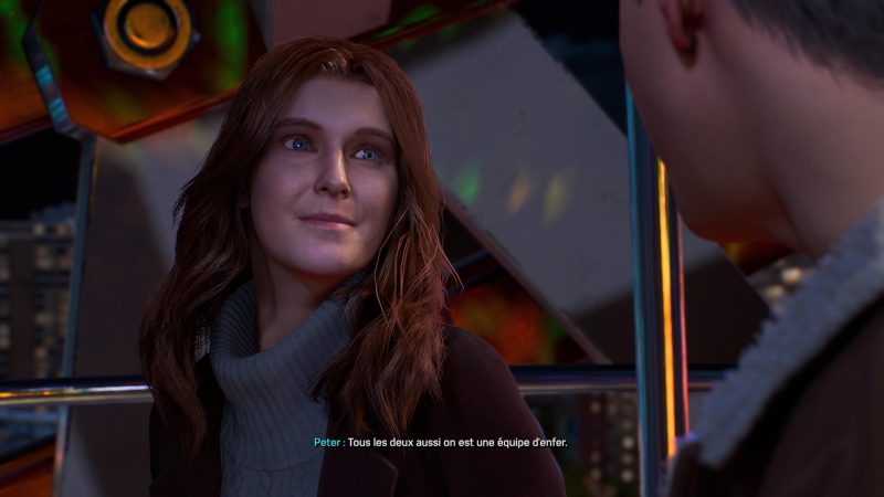 Parlons maintenant du scénario. Bon si vous connaissez les films, les comics spiderman, et les jeux de la saga Insomniac Games de l’homme araignée, vous ne serez pas dépaysés. Elément appréciable, Spiderman 2 PS5 propose un résumé des aventures précédentes, histoire de se remettre à jour. J’apprécie l’histoire que nous conte ce nouveau Spiderman, par contre, je ne compte pas vous spoiler et je ne dévoilerai rien afin de ne pas vous gâcher votre plaisir. Tout ce que je peux dire c’est que c’est bien foutu, même si cela reste, il est vrai très classique. En tout cas j’ai noté que la mise en scène est soignée (tout comme l’écriture). Les voix françaises sont correctes et la musique colle parfaitement à l’ambiance que dégage ce jeu. Les deux Spiderman ont évidemment toujours une petite blagounette à placer, c’est subtile, drôle mais jamais lourd. Le jeu propose de nombreuses scènes épiques quand d’autres sont plus intimes, elles sont toujours bien amenées et développées. Je n’ai pas grand chose à rajouter, je peux juste vous confirmer que l’ambiance est au rendez vous, ce jeu vidéo Spiderman 2 est vraiment plaisant.