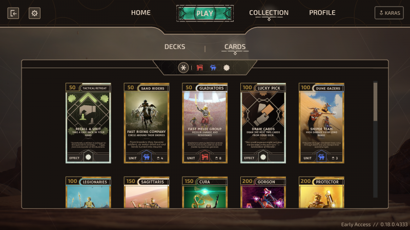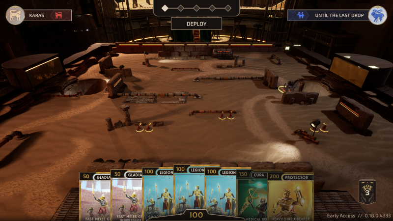 Vous connaissez Mechabellum ? On est dans la même veine mais avec un côté deckbuilder en plus. On a une large collection de cartes avec des unités ou des effets et on pioche dedans pour faire un deck équilibré (ou pas). Les unités sont spécialisées dans un type d’attaque, on peut voir dans le screenshot dessous une unité de cavaliers, de gladiateurs et de snipers. Il y a une description de leur point fort et c’est donc à nous de réfléchir dans quelle situation les utiliser. C’est la même chose pour les cartes avec des effets, on peut voir dans le screenshot en-dessous, la carte « Recall a unit » (Rappeler une unité en français). A quoi ça sert ? tout simplement à remettre une unité dans sa main. Car oui, chaque unité posée sur le plateau de jeu reste jusqu’à la fin de la partie à l’endroit où vous l’avez placée.